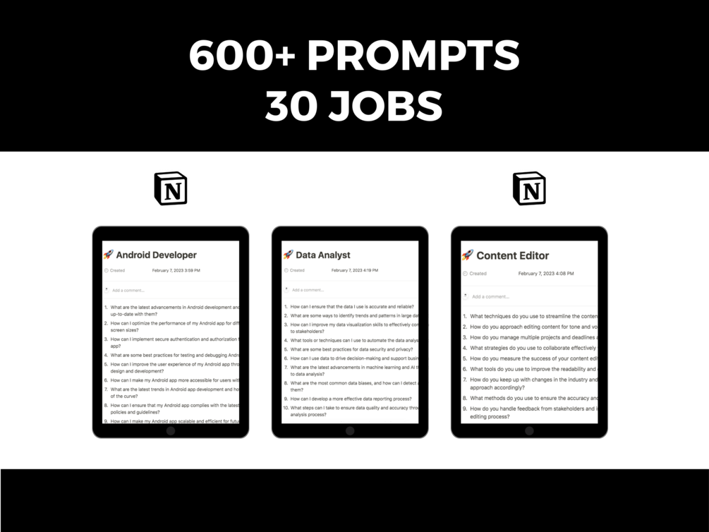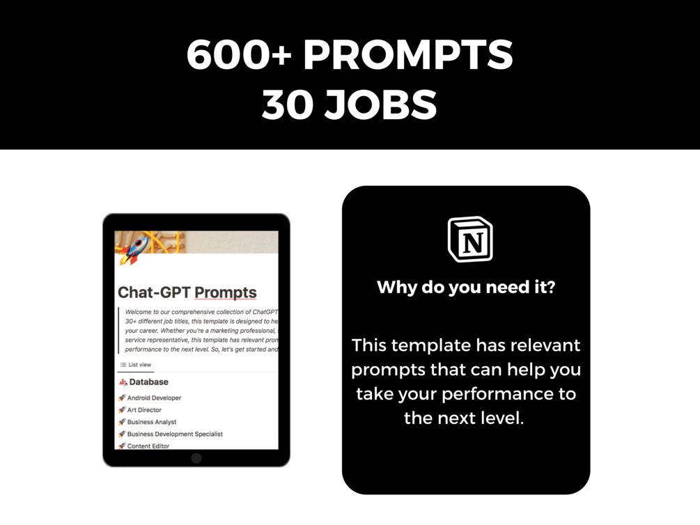 With over 600 prompts for 30+ different job titles, this template is designed to help you improve your skills and excel in your career.