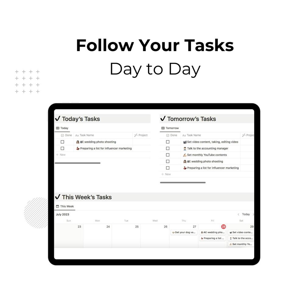 With a clean and intuitive layout, the template allows you to create and categorize tasks effortlessly. You can set priorities, due dates, and track progress with ease. The built-in calendar view provides a comprehensive overview of your schedule, ensuring you never miss a deadline.